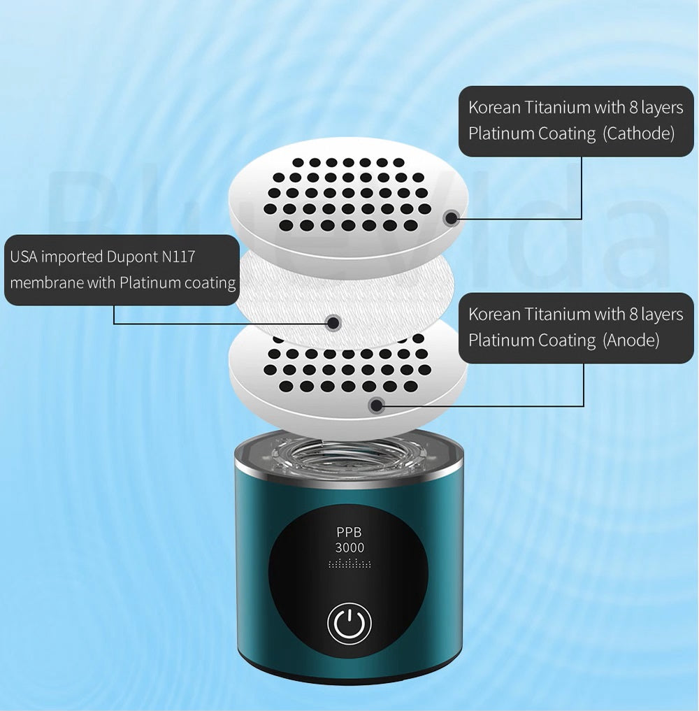 2. Touch the power button twice in quick succession (double tap), the light indicator will display 5minutes and the current amount of PPB hydrogen; touch the power button again to switch to 10 minutes. A large number of bubbles rising from the bottom indicates that the machine is making high concentrations of hydrogen.